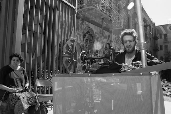 The mending cart started as a traveling project, but Swaine quickly learned that carting a treadle sewing machine around hilly San Francisco was not sustainable. He connected with Darryl Smith and Laurie Lazer of the Luggage Store Gallery, who offered to store his cart and let him set up in their alley, which they have transformed into a community space dubbed the Tenderloin National Forest. With their help, Swaine created a life-changing project.