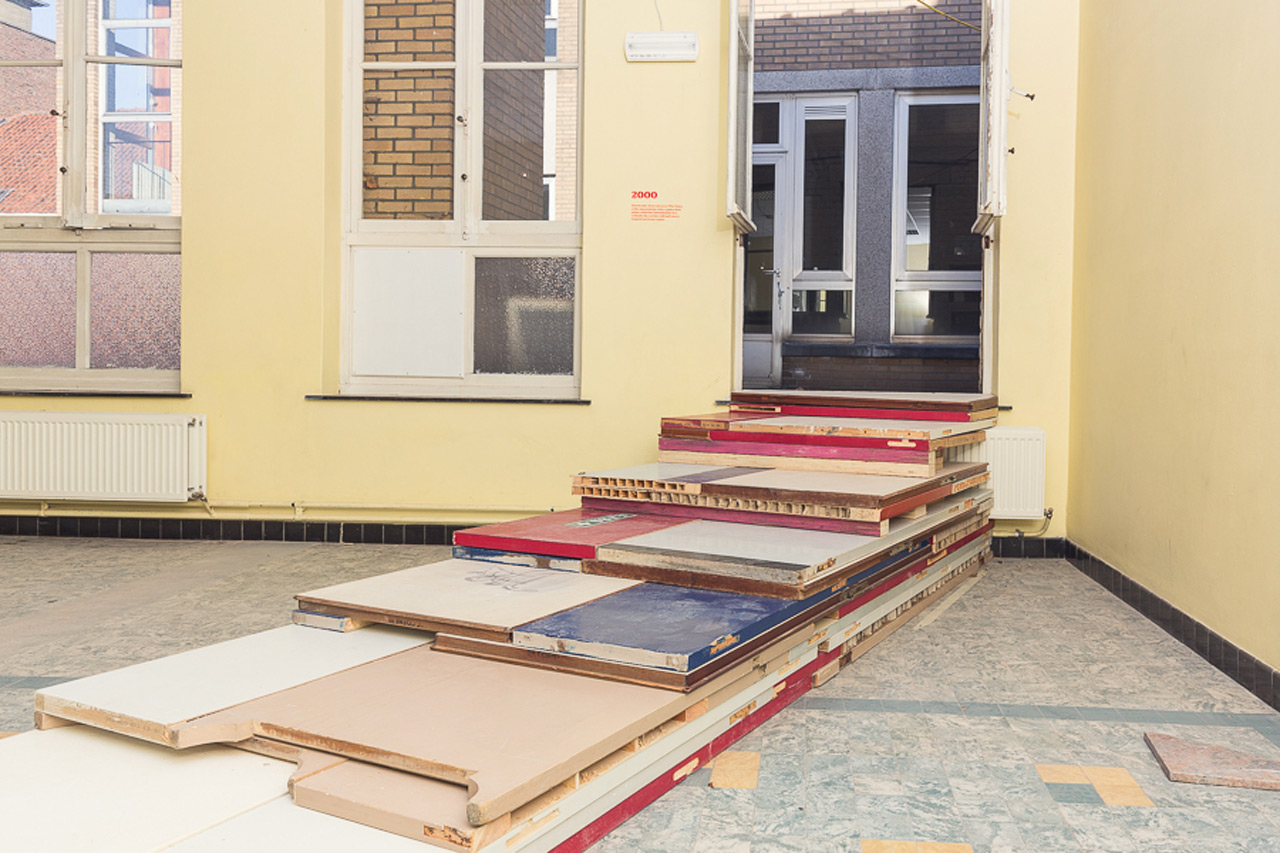In Kortrijk's Xpo building, Grima and his team built a stepped maze of Procoss shelving units, a modular system developed around the time of the first Biennale Interieur, and an allusion to the contemporary economy of Amazon-type mass distribution. Called "SQM: Theatre of everyday life," the installation (which includes both a children's play area and a path to the skylights) comprises objects, photographs, drawings, infographics, and films exploring both historic and contemporary notions of domesticity.