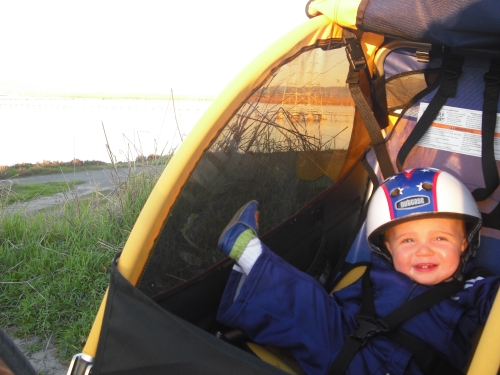 I prepare Jake for his first trip to Shoreline Park in his new-to-us "bike chariot". We couldn't find a used helmet on Craigslist so bought him a new Evil Knevil-styled helmet. It's an inside joke because Jake is precociously cautious.