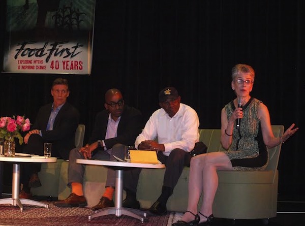 Panel discussion at the recent Food First 40th Anniversary. From left to right, Food First executive director Eric Holt-Gimenez, board member Michael Dorsey, board member Shyaam Shabaka, and Lappè. Photo: Christopher D. Cook.