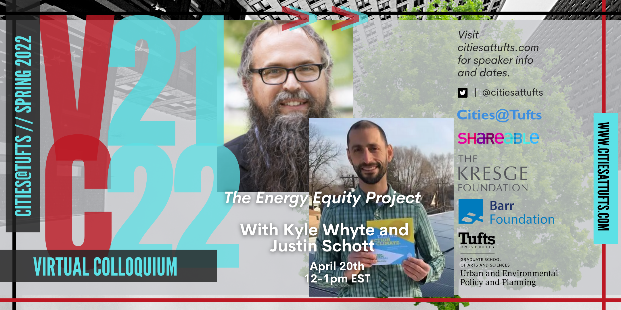 Lectures are scheduled on Wednesdays from 12-1 pm (est) in the Spring and Fall semesters and feature a 30-min presentation and 30-min discussion. Find the upcoming schedule (and recordings of past events) at https://www.shareable.net/cities-tufts/.