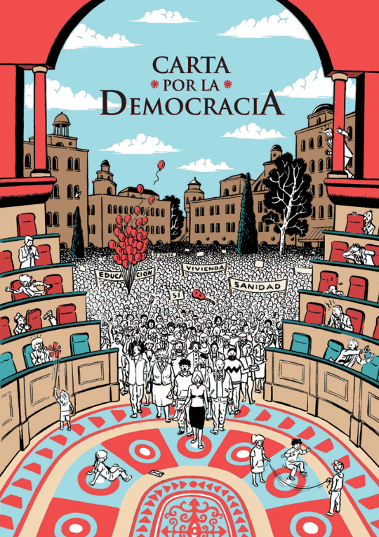 The Charter for Democracy is “a thoroughly detailed plan for the transformation of public policy and democratic representation, open for public challenge and participation,” said Troncoso, whose network of translators acted as “compilers and editors of a volunteer group-produced work” in making the English translation. A hearty thanks to translators Jaron Rowan, Jaime Palomera, Lucía Lara, Lotta, Diego, and Stacco Troncoso, with editing by Jane Loes Lipton. I love that the Charter is illustrated with some beautiful original illustrations by Clismón, one of which I include here.